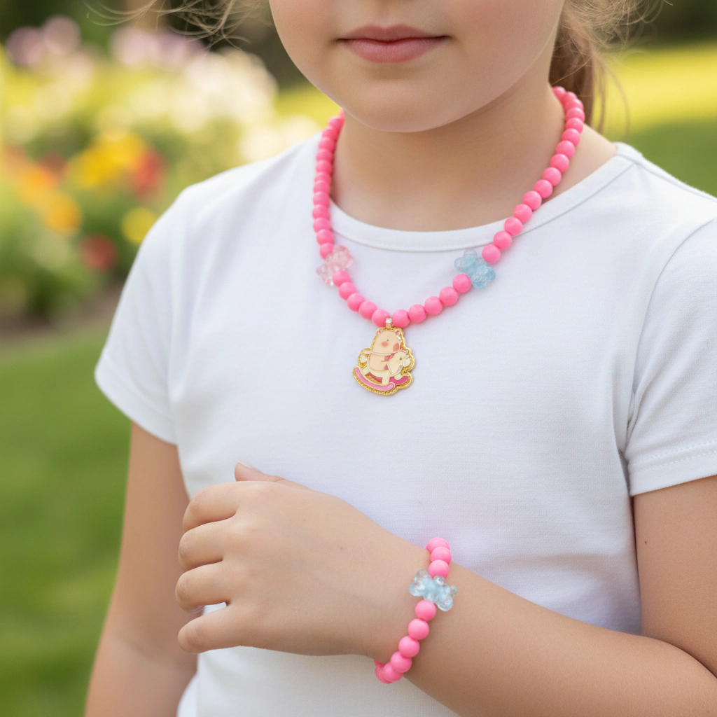 • Pingente Principal: O destaque é um pingente grande na parte inferior do colar. Ele apresenta um personagem de uma capivara sentado em um cavalo de balanço amarelo-dourado. O design é em estilo cartoon, colorido e brilhante,com glitter